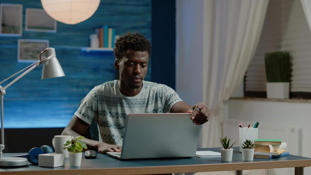 Natürliches Licht, Bildschirm auf Augenhöhe, bequemer Stuhl: Ergonomie ist Fürsorge. Stell dir Timer für kurze Dehnungen und nutze Telefonate für Steh‑ oder Geh‑Phasen. Dein Rücken wird es lieben, dein Kopf bleibt wacher und gelassener.
